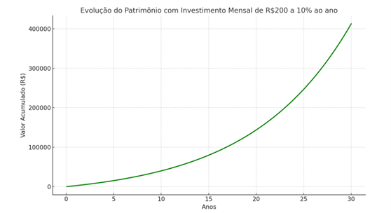 Esse crescimento mostra o poder dos juros compostos ao longo do tempo. Mesmo com aportes mensais de apenas R$200, o patrimônio ultrapassa R$450 mil em 30 anos.