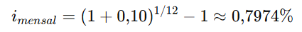 Esse valor é calculado com a fórmula de equivalência entre taxa anual e mensal em juros compostos: