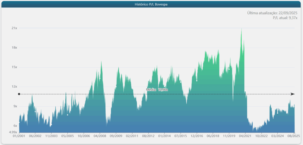 Atualmente (dados até início de 2025), o P/L do Ibovespa está em patamares abaixo da sua média histórica — muitas vezes entre 8x e 10x. Isso significa que, em média, as empresas estão sendo negociadas a preços que refletem apenas 8 a 10 anos de lucro — muito abaixo do normal.
