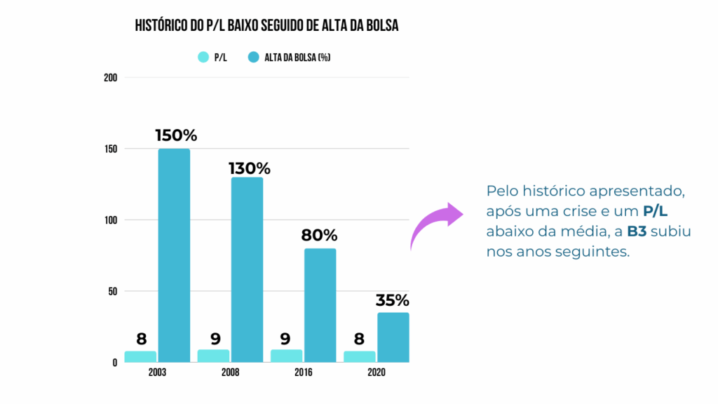 Isso acontece porque, quando o P/L está baixo, o mercado está extremamente barato — e investidores racionais enxergam a oportunidade. Assim que a confiança retorna, o fluxo de capital volta, e os preços sobem.